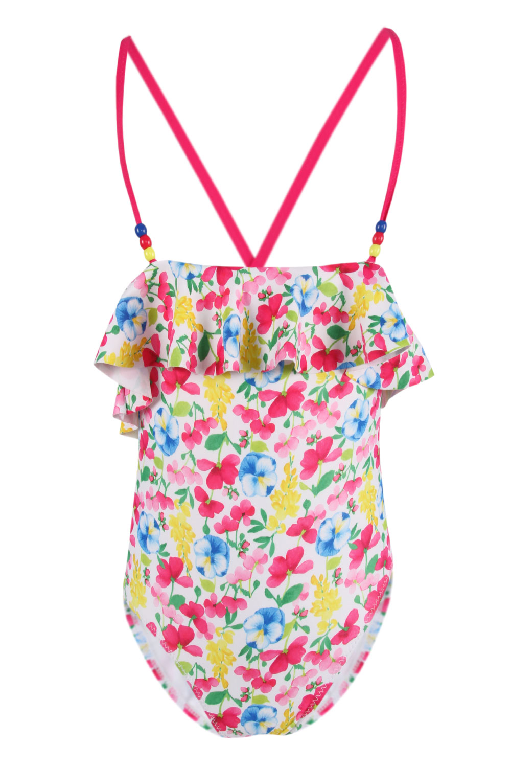 Dívčí jednodílné plavky Love s něžným letním vzorem pro malou parádnici. Plavky v horní části zdobí ozdobný kanýrek, Špagetová ramínka doplňují barevné korálky. Dívčí plavky Rychleschnoucí materiál Délkově nastavitelná ramínka Racer back ramínka – spojená mezi lopatkami